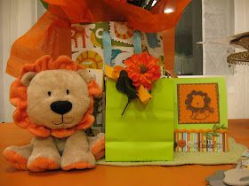 This is a close up of a little lion I found and used as part of the center piece, one of the prizes from the games, the little bag has bath salts, a candle, and lotion, and one of the invites.