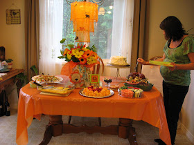 Today was my friend Sara's baby shower that I hosted at my home. We had a great time catching up with people we haven't seen for several months. I think everything turned out great! I served Mimosas, coffee, tea, soda, pasta salad, chili relleno pie, home made salsa, chips and hummus, fruit and veggie platters, monkey bread, and angel food cake.