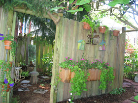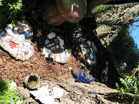 This path and bridge led us to the studio, bunny yard and dove houses. Notice the painting on the side of the house? And the mermaid hanging from the vine?