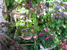 Basket of plants, with a little blue bunny peeking out. The was a very shaded garden, but lots of color was used, interesting to see if I can incorporate that in my yard too!