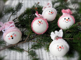 These little snowmen ornaments were so fun to make, I made 3 dozen. They are made using the clear ornaments from Michael's, white acrylic paint, infant socks from Walmart (a set of 3 pair for $4.99), small buttons for the nose from Michaels, a black sharpie marker for the eyes and mouth and pink acrylic paint for the cheeks and some glitter, ribbon and small jingle bells.