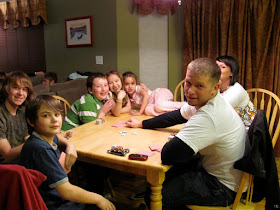 The poker players! beginning at the head of the table Noah, Cooper, Brayden, Sydney, Ellie, Lacey, and Adam.