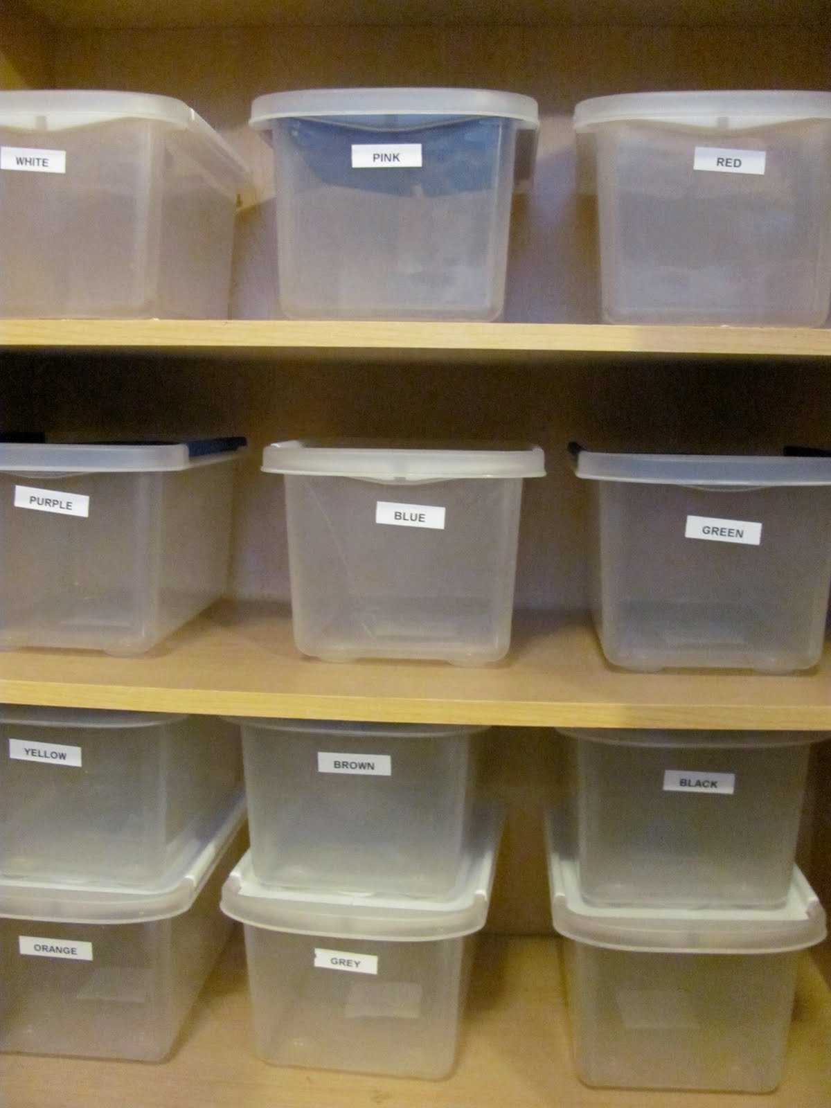 I bought 14 of these containers at the Dollar Tree and labeled them with each color. Then started dividing them into the containers.