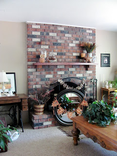 Picture that gorgeous black mirror up on the mantle. Now you may be wondering why I don't just prop it up there to take the picture? Well, let me explain. Umm, it is 1 inch too big, but I fell in love with it, and knew that if I brought it home the hubby could make it work. See the two little brick shelves above the mantle, well they leave an opening between them of 32 inches, the mirror is 33 inches. So the hubby is going to hang it from the ceiling for me so it will be in front of the two little shelves, which I hate by the way!