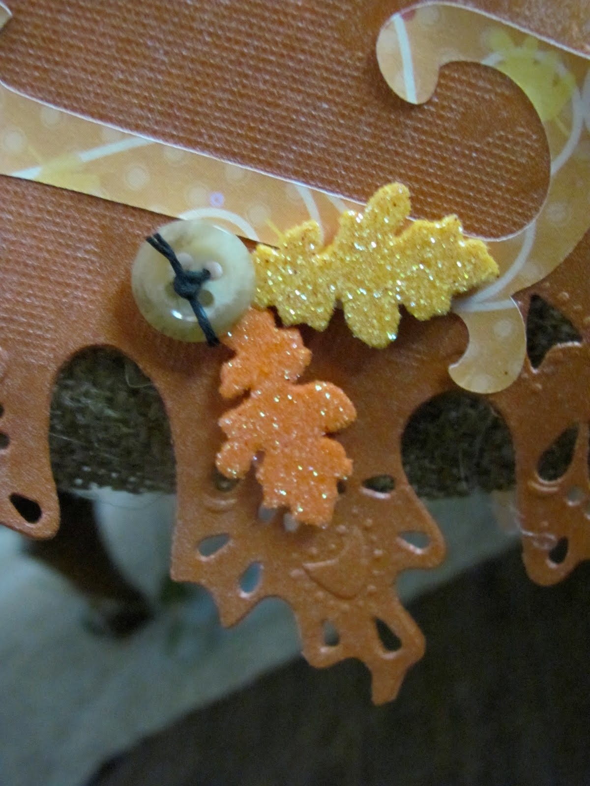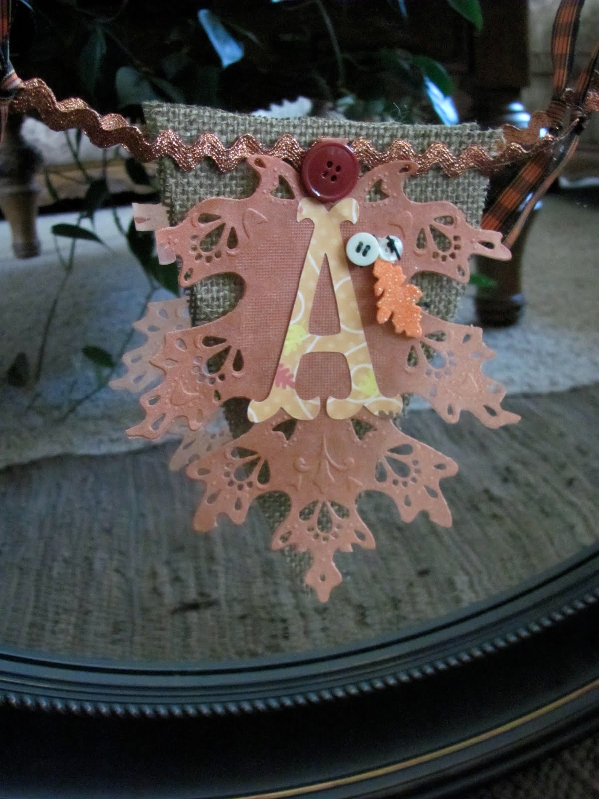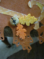 I placed my letters that I cut with my decorative paper and my Cricut on the doily leaves and added the glittery fall leaves that I also bought at the Dollar Tree on the same visit. I then added some buttons*grin*.