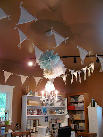 Then added some drop cloth pennants with twine and ribbon. In the background you can see the desk/hutch my hubby built for me 6-7 years ago. I will do a more detailed post more towards the end of the month.