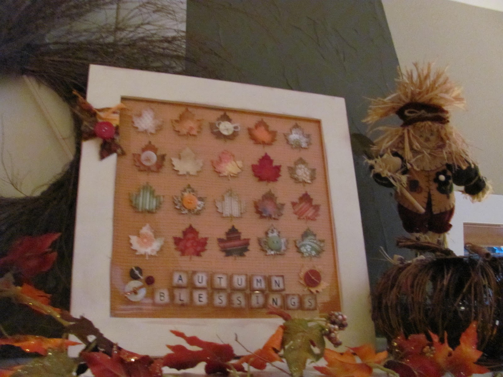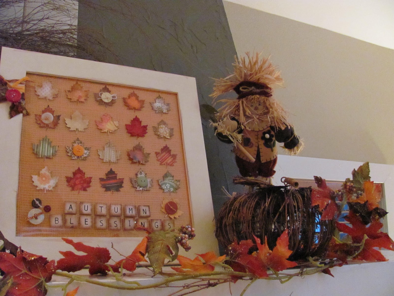 I loved the fall leaf frame I made for the craft cottage so much I had to make a larger one for the mantel in the house. I used orange burlap behind it and added buttons. I placed in/on a 12x12 frame that I had already painted off white and distressed the edges on. Added more of the scrabble times with the edges inked with distress ink.