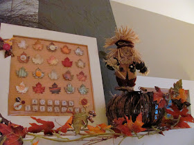 I loved the fall leaf frame I made for the craft cottage so much I had to make a larger one for the mantel in the house. I used orange burlap behind it and added buttons. I placed in/on a 12x12 frame that I had already painted off white and distressed the edges on. Added more of the scrabble times with the edges inked with distress ink.